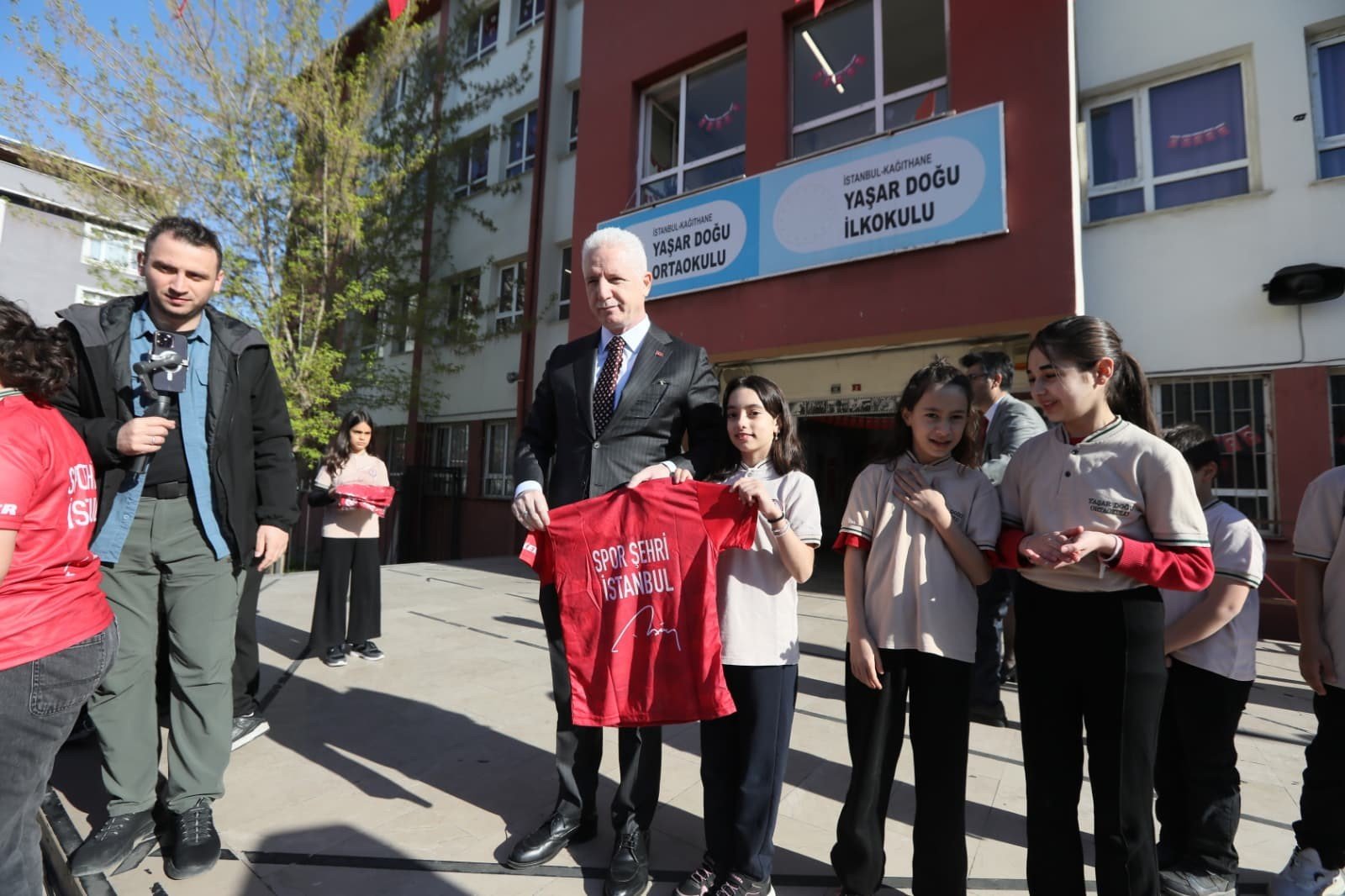 İstanbul Valisi Davut Gül, Kağıthane’de bulunan Yaşar Doğu Ortaokulu’nu ziyaret etti. Ziyaret kapsamında okul bahçesinde gerçekleştirilen İstiklal Marşı törenine katılan Vali Gül’e Kâğıthane Belediye Başkanı Mevlüt Öztekin, İl Milli Eğitim Müdürü Murat Mücahit Yentür, Kâğıthane Kaymakamı Yüksel Kara, okul idarecileri, öğretmenler, öğrenciler ve veliler eşlik etti. Törenin ardından sınıfları gezen ve öğrencilerle sohbet eden Vali Gül, “Spor Şehri İstanbul” projesi kapsamında tüm öğrencilere milli takım forması dağıtımında bulundu.